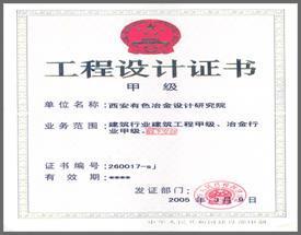 西安有色冶金設計研究院具有國家建設部、國家發改委頒發的冶金行業、建筑行業、工程咨詢、工程造價四項設計、咨詢甲級資質和城市規劃、工程監理、壓力管道、安全評價四個乙級資質。可承擔國內外大、中型冶金、礦山工程、土木建筑工程可行性研究、初步設計、施工圖設計以及科研攻關、機電一體化、自動化技術研究,并能進行工程項目管理、工程監理和工程承包,是《陜西省工程勘察設計行業從業公約》發起單位,通過ISO9001-2000質量管理體系、ISO14000-2004環境管理體系、OHSAS18000職業健康安全三大管理體系認證。