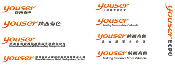 同時,在英語中er是表示人的名詞化后綴,比如teacher; worker等。因此,youser體現(xiàn)企業(yè)是人的聯(lián)合體,體現(xiàn)企業(yè)“以人為本”的核心理念。標志以完全獨立設(shè)計的美術(shù)英文字體為為主體,配以中文字體,具備獨特性,同時更加適合同權(quán)屬企業(yè)標志組合。標志色彩為初升太陽的橘紅色,象征著陜西有色集團作為新型的大型集團企業(yè),好像一輪蓬勃的紅日,朝氣蓬勃。