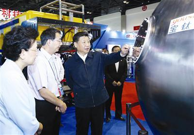 新華社照片,北京,2016年6月3日,中共中央總書記、國家主席、中央軍委主席習近平在北京展覽館參觀國家“十二五”科技創新成就展時,在寶鈦集團生產的4500米深潛器球殼前駐足了解情況,并給予高度評價。 新華社記者 鞠鵬 攝