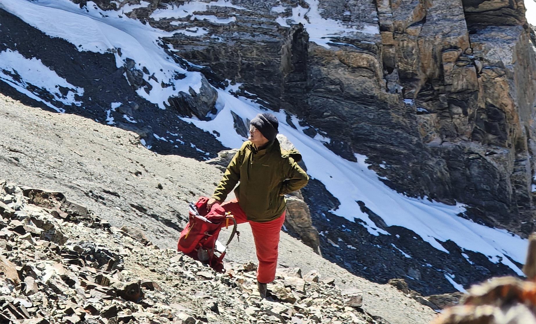 風雪是自然最凌厲的筆觸,把地質人塑成移動的“雪人”。濃霧彌漫處,巖石的棱角在能見度不足五米的混沌里隨時成了可能傾覆的陷阱。那頂被積雪壓彎的寬檐帽,在雪粒中仍緊盯著巖石的眼鏡,雪窩里深深淺淺不一的足印——每一步都是對“艱辛”專業和意志的考驗。在海拔3600米的碎石坡上,地質錘的敲擊聲被狂風撕碎,卻從未停下節奏;在零下十幾度的嚴寒里,凍僵的手指仍牢牢攥著羅盤,只為勾勒出地層最真實的褶皺。