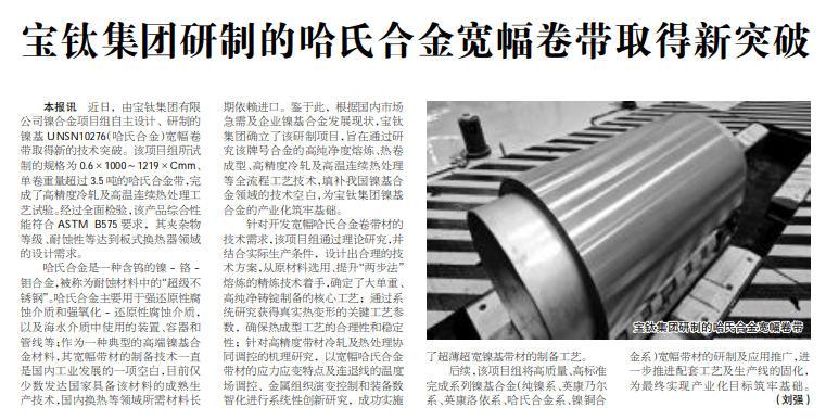 中國有色金屬報、有色新聞、搜狐新聞、網(wǎng)易新聞、今日頭條、陜工網(wǎng)、西北在線:寶鈦集團(tuán)鎳合金項目組研制的哈氏合金寬幅卷帶取得新突破