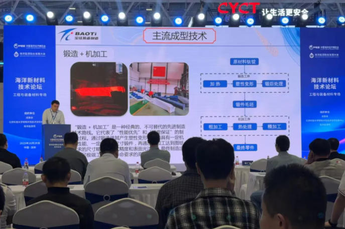 展會期間,寶鈦股份營銷部門與寶鈦研究院專家團隊緊密配合,為來自全球的海洋裝備制造商及科研機構提供從技術咨詢到商務洽談的一站式專業服務。在“海洋新材料技術論壇——工程與裝備材料專場”上,裝備制造公司趙彤作專題技術報告,分享了寶鈦在高端裝備材料應用方面的最新研究成果。