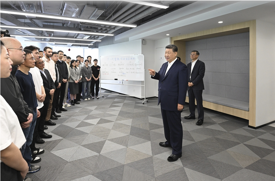 4月29日,中共中央總書記、國家主席、中央軍委主席習(xí)近平在上海考察。這是習(xí)近平在位于徐匯區(qū)的上海“模速空間”大模型創(chuàng)新生態(tài)社區(qū),同正在參加“下一代智能體的自主進(jìn)化”主題沙龍的青年創(chuàng)新人才親切交流。新華社記者 謝環(huán)馳 攝