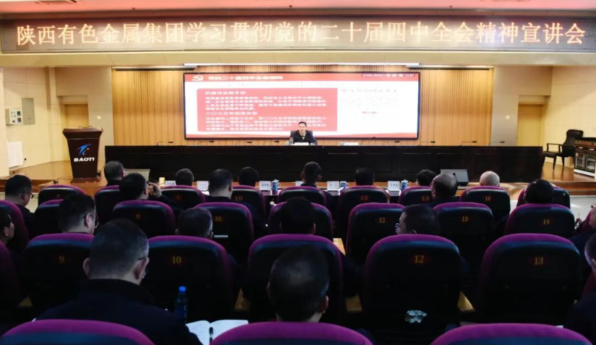 11月25日,陜西有色金屬集團黨委副書記、董事、總經理莫勇到寶鈦集團宣講黨的二十屆四中全會精神并調研。寶鈦集團黨委書記、董事長王儉主持宣講會并陪同調研。