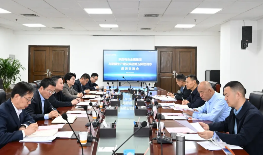 4月8日,陜西有色金屬集團(tuán)黨委副書記、董事、總經(jīng)理莫勇在集團(tuán)總部與來訪的新疆生產(chǎn)建設(shè)兵團(tuán)第五師雙河市黨委常委、副師長丁智勇一行就地質(zhì)找礦和口岸貿(mào)易合作等座談交流。