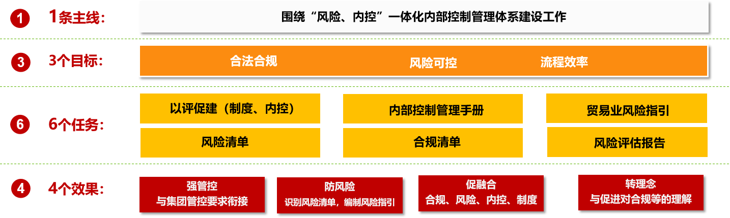 高標準規劃:緊扣“風險、內控一體化建設”這一主線,按照“1364”思路系統推進——錨定合法合規、風險可控、管控高效三大目標,一體完成內控診斷報告、風險清單、合規清單、風險評估報告、內部控制手冊、貿易業務風險指引六項任務,全面達成強管控、防風險、促合規、轉理念四項成效,為企業高質量發展筑牢堅實屏障。
