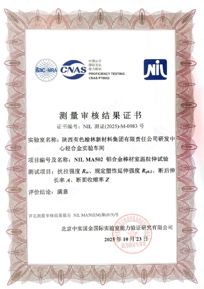近日,榆林新材料集團研發(fā)中心鋁合金中化學成分分析、鋁合金棒材室溫拉伸測定、粉末粒度分析(激光衍射法)測定三個項目順利通過國家CNAS實驗室測量審核能力驗證,評價結果均為“滿意”,并獲得能力驗證證書,證明其檢測技術能力已符合中國合格評定國家認可委員會(CNAS)實驗室認可要求。
