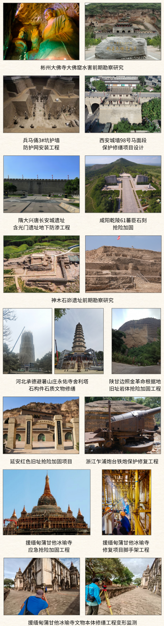 當歷史的塵埃落定,文物成為文明傳承的鮮活載體。工程公司深耕文物保護領域近30載,用專業與創新鑄就品牌力量,是文物保護領域的“生力軍”。如今,工程公司已構建起覆蓋文物勘查、評估、勘察設計、施工、預防性保護,文物遷移以及數字化應用的全鏈條服務體系,業務范圍涵蓋古遺址、古墓葬、古建筑、石窟寺、石刻及近現代重要史跡等各類文物保護。公司立足陜西,輻射全國十余省市,更成功拓展至緬甸等共建“一帶一路”國家,跨區域、跨文化服務綜合實力尤為突出。