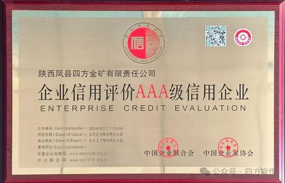 四方金礦始終秉持誠信經營、合規發展理念,嚴格遵循行業信用規范,系統構建法律風控體系,全面履行國企社會責任,社會影響力和品牌美譽度不斷提升。繼2024年獲得中國企業聯合會、中國企業家協會頒發的AAA級企業信用等級證書后,此次再獲有色金屬行業企業最高信用等級評價,為公司健康可持續發展提供了有力支撐。