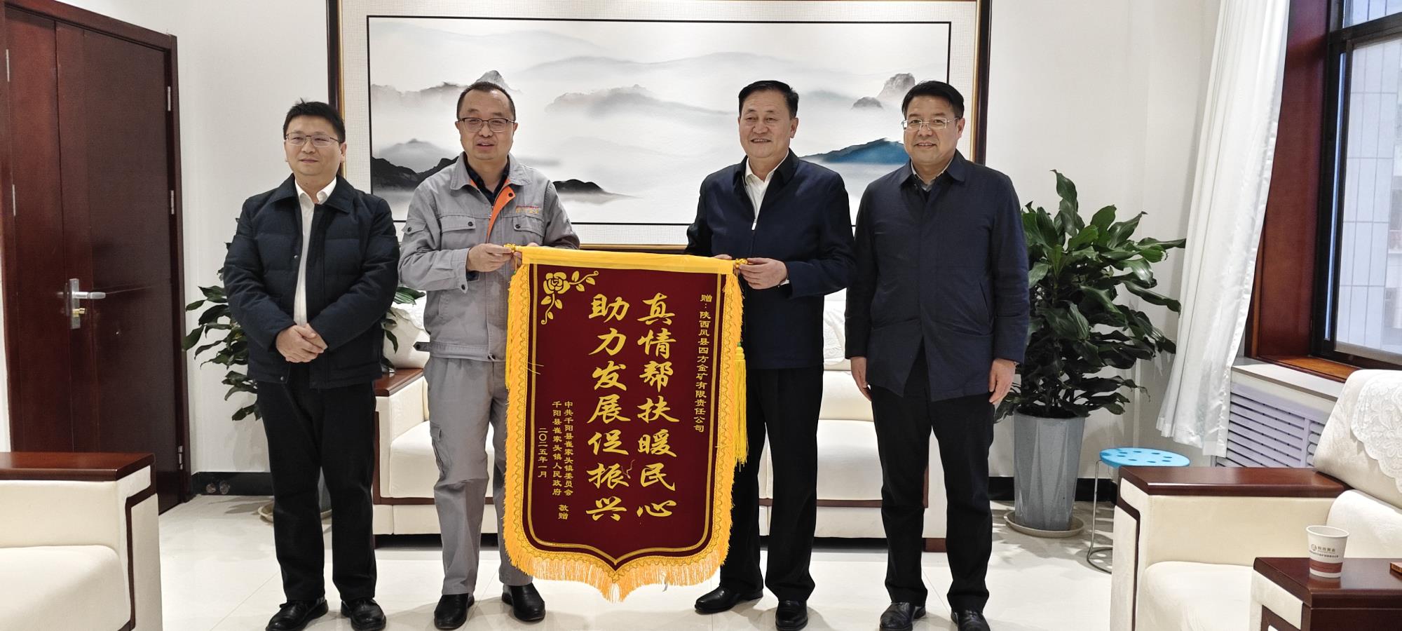 1月7日,寶雞市千陽縣縣委常委、副縣長何紅軍,副縣長李弦一行到黃金集團(tuán)四方金礦座談交流,深化政企合作。千陽縣領(lǐng)導(dǎo)對四方金礦駐村幫扶工作成效給予高度肯定,向公司贈予了“真情幫扶暖民心 助力發(fā)展促振興”錦旗。