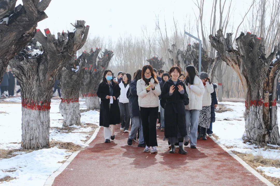 全程2公里的環湖步道化身為健康長廊,一夜春雪簌簌,道路兩旁積雪堆疊,滿是大自然饋贈的浪漫與詩意。女職工們三五成群結伴,既有你追我趕的活力比拼,也有駐足留影的歡聲笑語。沿途設立的打卡拍照點和兩個"能量補給站"貼心提供姜汁可樂、小零食,為奮進的腳步注入滿滿元氣。本次活動創新融入趣味挑戰元素,“不服來Battle”“奔跑小分隊”“圓舞曲”“步步為贏”等四大主題游戲互動沿步道分布。女職工們在運動間隙參與挑戰,熱情高漲。
